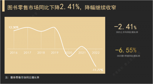 2023上半年图书零售市场较2022年同期下降了2.41%,和第一季度相比降幅继续收窄。2023年作为疫情后恢复的第一年,从指数情况来看,实体店渠道第一季度指数同比降幅超过了30%,第二季度指数降幅有所收窄,但是上半年除了2月和6月超过100点外,其余月份均在100点之下。网店渠道指数在第一季度出现了小幅下降,第二季度指数同比转为正向增长,但是有一点需要注意,4月网店渠道增幅较高主要是因为去年同期处于低位,进入年中大促期之后,5月和6月的网店渠道指数反而出现小幅下滑。