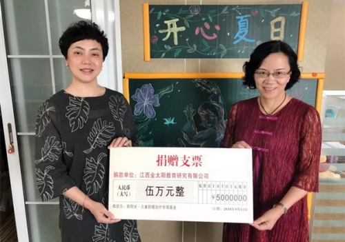 2018年9月12日,金太阳教育集团运营中心总监罗启碧女士受公司委托,不远千里专程前往北京,代表江西金太阳教育研究有限公司向新阳光•儿童舒缓治疗专项基金捐助善款伍万元整,用以资助患病儿童的舒缓治疗费用,送去金太阳教育的爱心与温暖。当日,罗启碧女士还随相关人员参观了舒缓中心,悉心询问专项基金的发展状况,看望并慰问了血液肿瘤患儿及家属,鼓励他们乐观生活。