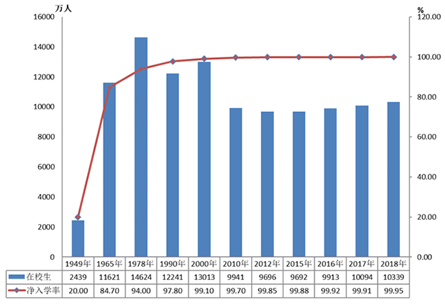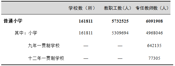 全国共有普通小学16.18万所,比上年减少0.52万所,下降3.11%。另有小学教学点10.14万个,比上年减少0.16万个。招生1867.30万人,比上年增加100.74万人,增长5.70%;在校生10339.25万人,比上年增加245.56万人,增长2.43%;毕业生1616.49万人,比上年增加50.59万人,增长3.23%。小学学龄儿童净入学率[6]达到99.95%。