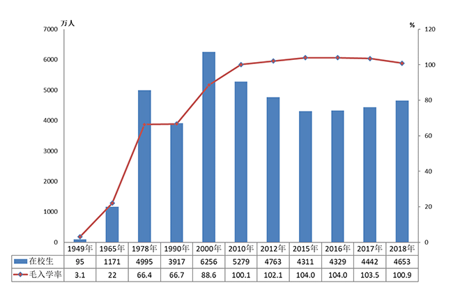 [4]毛入学率,是指某一级教育不分年龄的在校学生总数占该级教育国家规定年龄组人口数的百分比。由于包含非正规年龄组(低龄或超龄)学生,毛入学率可能会超过100%。