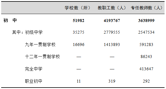 全国共有初中学校5.20万所(含职业初中11所),比上年增加88所,增长0.17%。招生1602.59万人,比上年增加55.37万人,增长3.58%;在校生4652.59万人,比上年增加210.52万人,增长4.74%;毕业生1367.77万人,比上年减少29.70万人,下降2.13%。初中阶段毛入学率[4]100.9%。
