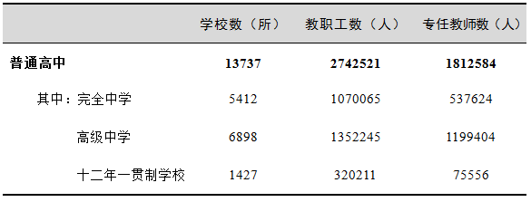 普通高中教职工274.25万人,比上年增加7.74万人,增长2.91%;专任教师181.26万人,比上年增加3.86万人,增长2.18%。生师比13.10:1;专任教师学历合格率98.41%,比上年提高0.26个百分点。