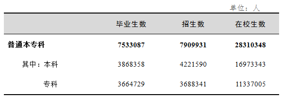 普通本专科招生790.99万人,比上年增加29.50万人,增长3.87%;在校生2831.03万人,比上年增加77.45万人,增长2.81%;毕业生753.31万人,比上年增加17.48万人,增长2.38%。