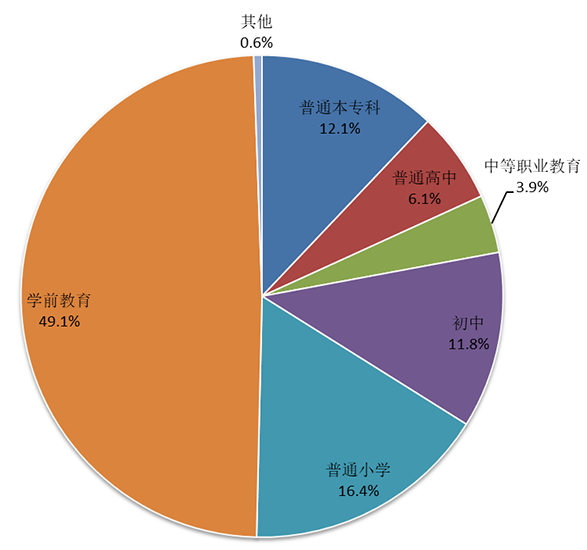全国共有各级各类学校51.88万所,比上年增加5017所,增长0.98%;各级各类学历教育在校生2.76亿人,比上年增加539.40万人,增长2.00%;专任教师1672.85万人,比上年增加45.96万人,增长2.83%。