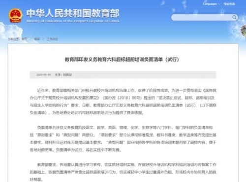 近年来,教育部等相关部门积极开展校外培训机构治理工作,取得了阶段性成效。为进一步贯彻落实《国务院办公厅关于规范校外培训机构发展的意见》(国办发〔2018〕80号)提出的“坚决禁止应试、超标、超前培训及与招生入学挂钩的行为”要求,日前,教育部办公厅印发义务教育六科超标超前培训负面清单(试行)(以下简称负面清单),为各地查处培训机构超标超前培训行为提供了具体依据。
