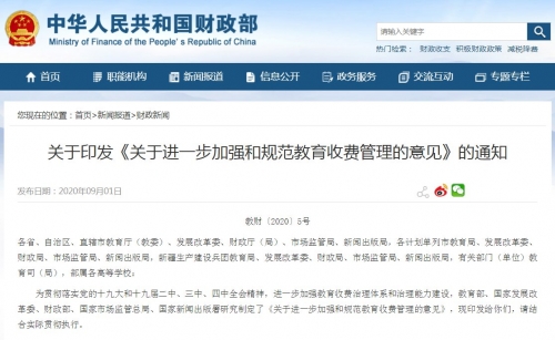 为贯彻落实党的十九大和十九届二中、三中、四中全会精神,进一步加强教育收费治理体系和治理能力建设,教育部、国家发展改革委、财政部、国家市场监管总局、国家新闻出版署研究制定了《关于进一步加强和规范教育收费管理的意见》(简称《意见》)。日前,教育部等五部门印发《关于进一步加强和规范教育收费管理意见》的通知(简称《通知》),要求各地按照规定的管理权限全面落实教育收费管理主体责任,正确处理好政府与社会、受教育者的关系,正确处理好教育收费与财政拨款、学生资助的关系,正确处理好简政放权和放管结合、优化服务的关系,进一步完善教育收费政策体系、制度体系、监管体系,提升教育收费治理能力。